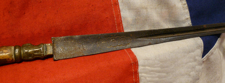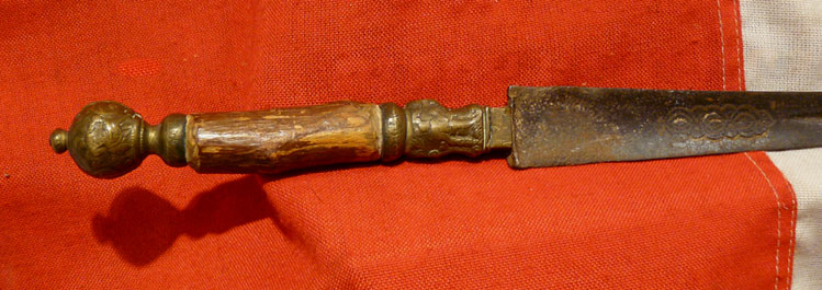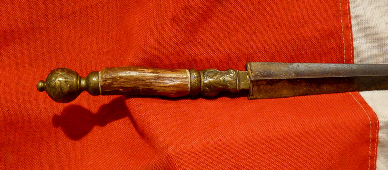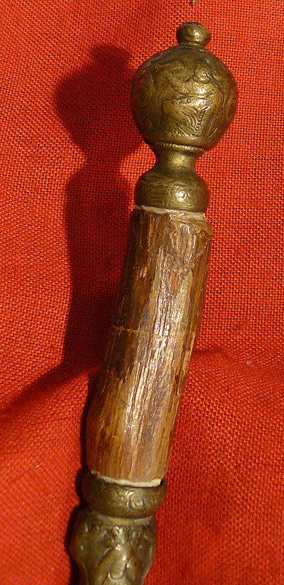 Cast brass hilt with relief figural decoration, and hawthorn wood grip. Steel rapier blade with engraving and deep fuller. Circa 1750. The knuckle bow and guard have been purposefully removed and the hilt re-attached. We had one quite similar, around 20 years ago, which came with an old article from a Connoisseur journal, It described, what was called, a boot or cloak sword. In the days of the threat by highwaymen, when a gentleman may have the need to consistently travel from town to town on horseback, but not by mail coach, a constant traveler might adapt a sword that could be easily slotted into knee high riding boots, or slipped into an especially constructed sleeve inside a riding cloak. For in wet and inclement weather a gentleman's flintlock pistol could not function, so without a sword for protection he was dangerously defenseless. Naturally a standard rapier short sword would be more normal, but on occasion, a gentleman that traveled constantly, or journeyed on perilous pursuits [such as a revenue man] might require a more concealable sword that would be far more easily manageable on both horseback or on foot. It also has the unique advantage of being eminently useable as a short distance spear type weapon, as it's weight balance is now very effective for that alternate purpose. 29.75 inches long overall