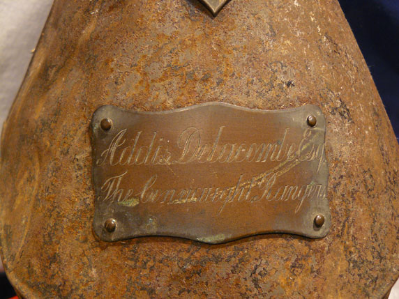 the case which is emblazoned with the makers name Hawkes and a brass plaque with the officer's name and regiment engraved, Addis Delacombe Esq Connaught Rangers. The 1st Battalion deployed to South Africa as part of 5th (Irish) Brigade which was commanded by Major-General Fitzroy Hart. The Rangers took part in numerous engagements during the Boer War.