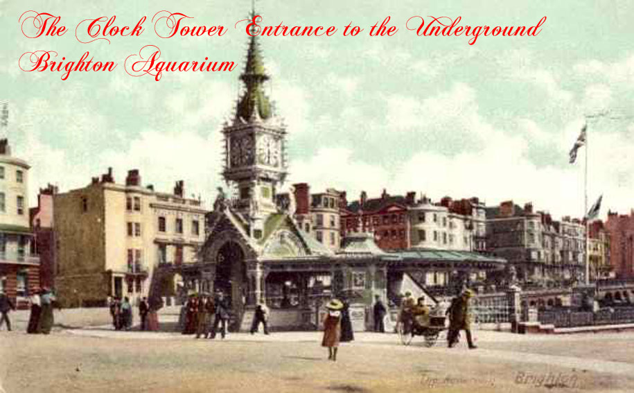 The wide corridor led to a conservatory which had an attractive grotto complete with a cascade of water. Later this became a popular meeting place. Although the building was far from ready, it was decided to open on Easter Saturday 1872. with the idea that the official opening would take place during August, when the premises would have been completed. Queen Victoria's third son. Prince Arthur, arrived that Easter, in Brighton, with Prince Edward of Saxe-Weimar. The Royal Party expressed a wish to see the new Aquarium and it was necessary to carry out immediate work on the roadway in order that the Royal Party and their ladies could enter the Aquarium without sinking up to their ankles in mud. With flags flying, the Princes enjoyed their visit. Pausing "ever and anon" to view the interesting specimens. The Press described this impromptu opening as "very propitious" and "It could scarcely have entered the minds of any of the most sanguine of the Aquarium directors that its opening would be attended by a Prince of the Blood Royal. On August 10th 1872 the Mayor, Sir Cody Burrows, declared the premises open, despite great problems with contractors, a difficult site, the sea and the weather, plus many battles with Parliament and Brighton Council. The Aquarium Clock Tower became famous all over the world and picture postcards