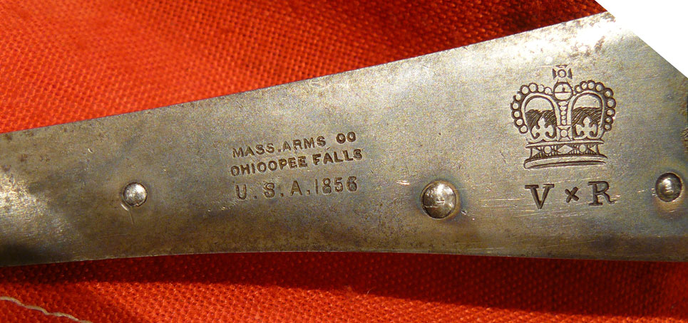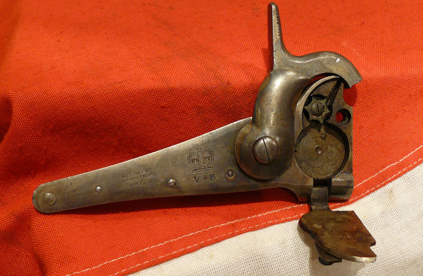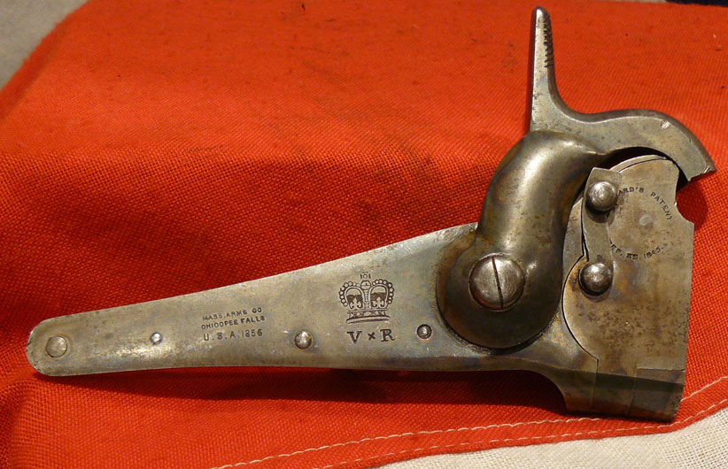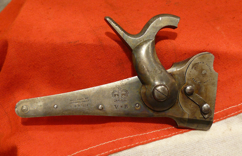 Case-hardened swivel breech action with Maynard tape primer system. Lock marked: Queen's crown /VR/Mass.Arms Co./U.S.A./1856.
