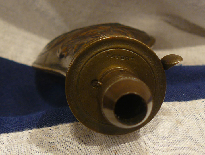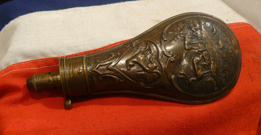A jolly attractive flask in nice operating order with original lacquer finish. Decorated with stags and hounds on both sides.