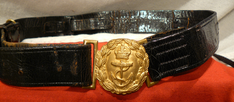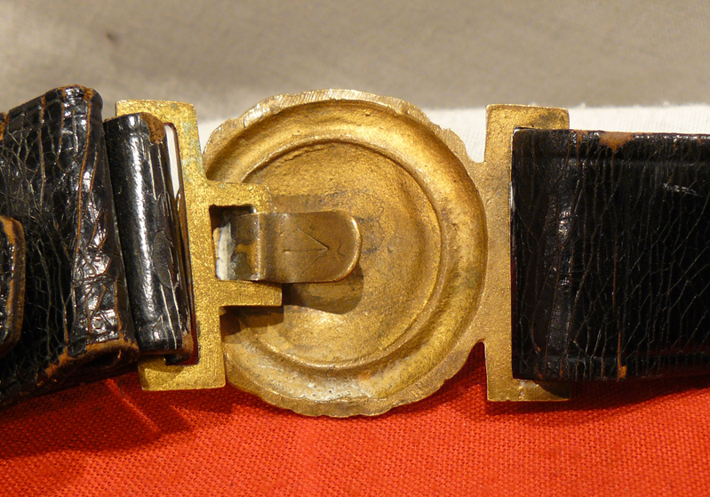 Gilt bronze buckle with patent leather belt, however the belt is pretty worn and very small size.