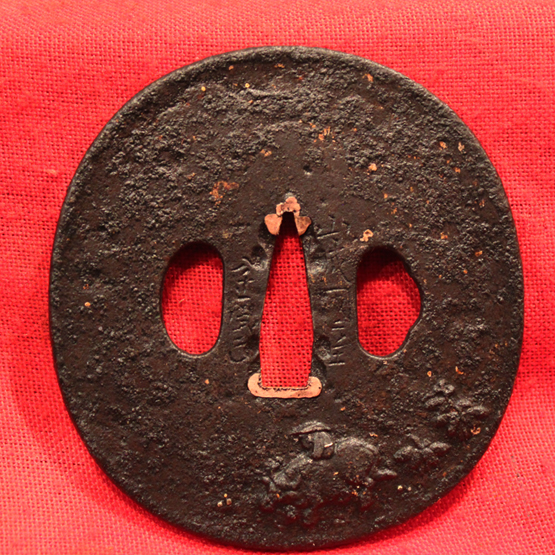 Originally tachi or uchigatana mounted this fabulous and ancient sword was remounted likely 400 years ago as a katana, as usual under the edict of the Tokugawa. Signed tsuba decorated with a figure on a water buffalo and small pure gold inlaid dots. Gilt decorated fushi kashira, the fushi with depicting jungle fauna and the kashira with a takebori tiger. Gold silk bound tsuka over bronze shishi on black samegawa. Set off with a dark red stone finish ishime lacquer saya. The blade has an incredibly beautiful and complex hamon pattern, with just a couple of thin, natural openings due to it's great age. The uchigatana was the predecessor to the katana as the battle-blade of feudal Japan's bushi (warrior class), and as it evolved into the later design, the two were often differentiated from each other only by how they were worn and by the fittings for the blades.