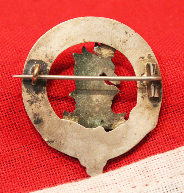 Silver colour, but not hallmarked. Mea Gloria Fides, Fidelity is my glory. Possibly the Gallagher clan, the Gallagher motto is the same, this the heraldic symbol not normally a griffon.