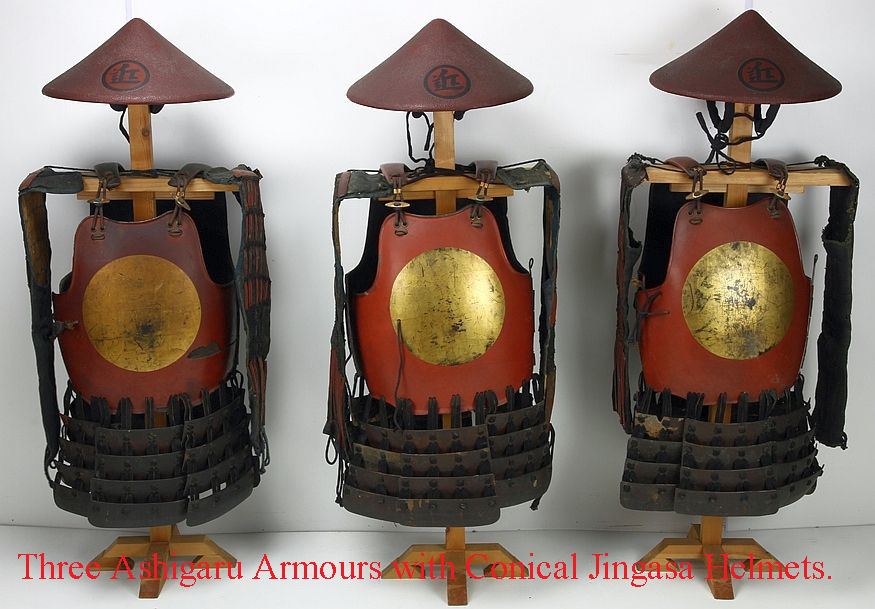 Toppai jingasa with agari-fuji mon. The clan claims descent from Abe Hirafu and Abe Nakamaro. The clan served the Tokugawa clan during Edo Period. Their first recorded family head, Andō Naotsugu was eldest son of Andō Haruyoshi and grandson of Ando Ieshige, retainer of Matsudaira Hirotada (father of Tokugawa Ieyasu). Ashigaru were foot-soldiers employed by the samurai class of feudal Japan. The first known reference to ashigaru was in the 14th century, but it was during the Ashikaga shogunate, Muromachi period, that the use of ashigaru became prevalent by various warring factions. shigaru were commonly armed with naginata, yari, yumi and swords. Ashigaru armour varied depending on the period, from no armour to heavily armored and could consist of conical hats called jingasa made of lacquered hardened leather or iron, cuirasses (do), helmets (kabuto), armoured hoods (tatami zukin), armored sleeves (kote), greaves (suneate), and cuisses (haidate).
