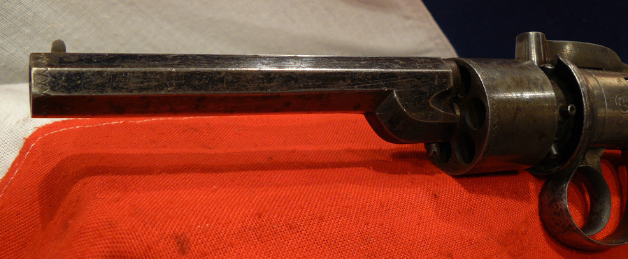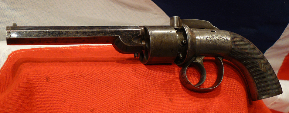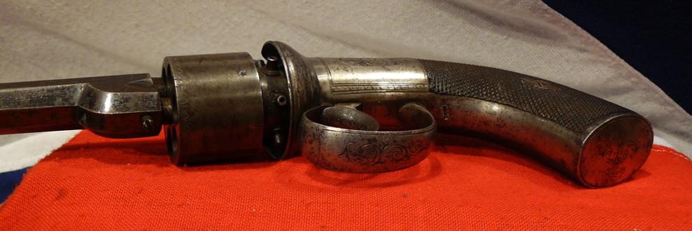 6 shot .36 cal. Probably by Robert Adams, though un-named. Some of the most ground breaking work in the early design and manufacture of revolvers was undertaken in England long before the world famous American revolver makers, such as Colt and Remington, became famous for their fine pistols. This most attractive piece is fully, and most finely engraved, on the frame and grip, with a highly detailed micro chequered walnut butt. Circa 1850. A classic example of one of the earliest English cylinder revolvers that was favoured by gentleman wishing to arm themselves with the latest technology and improvement ever designed by English master gunsmiths. They were most popular with officers that could afford them in the Crimean War and Indian Mutiny, as this one was used.