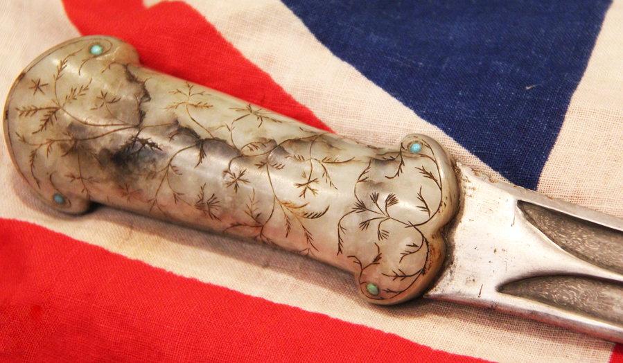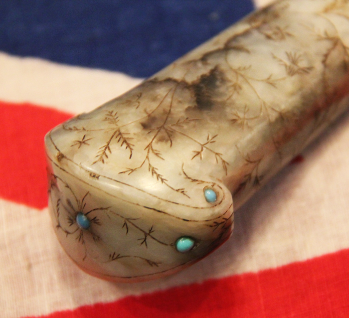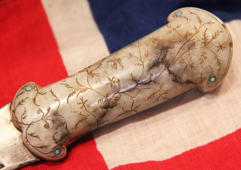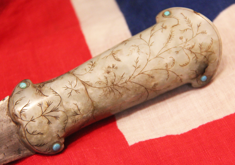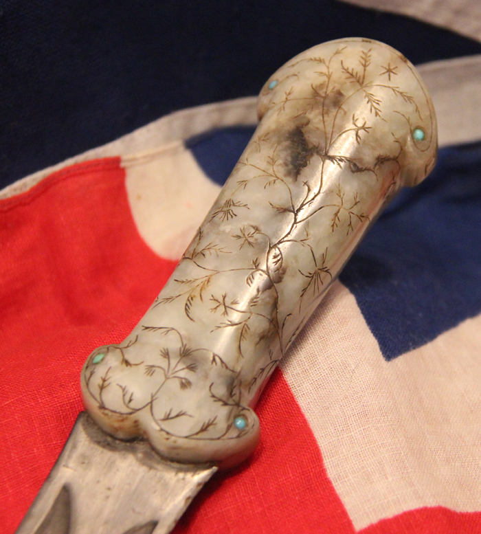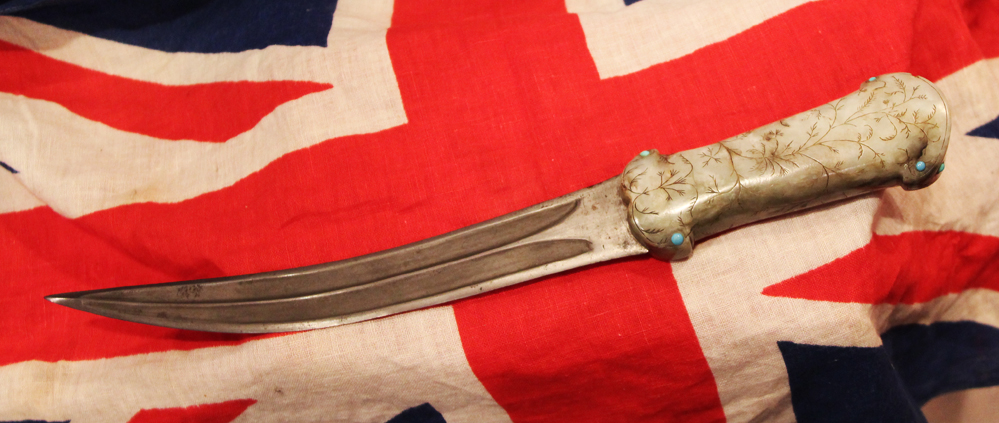 With wootz Damascus blade. An 18th to 19th century dagger khanjar, with a curved double edged watered wootz blade 24cms long, cut with a pair of deep fullers with medial ridge, mounted with a fine one piece jade hilt engraved and incised overall with foliage and inlaid with cabochon turquoise at the corners and on the pommel. The Mughal (or Moghul) Empire was an early-modern empire in South Asia. For some two centuries, the empire stretched from the outer fringes of the Indus basin in the west, northern Afghanistan in the northwest, and Kashmir in the north, to the highlands of present-day Assam and Bangladesh in the east, and the uplands of the Deccan plateau in South India.