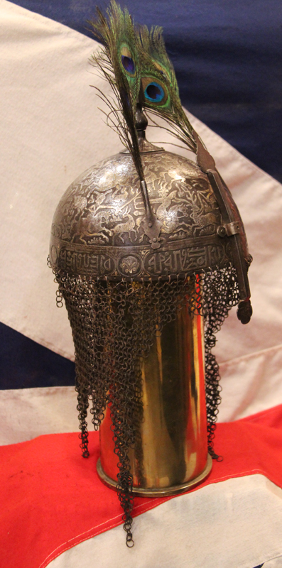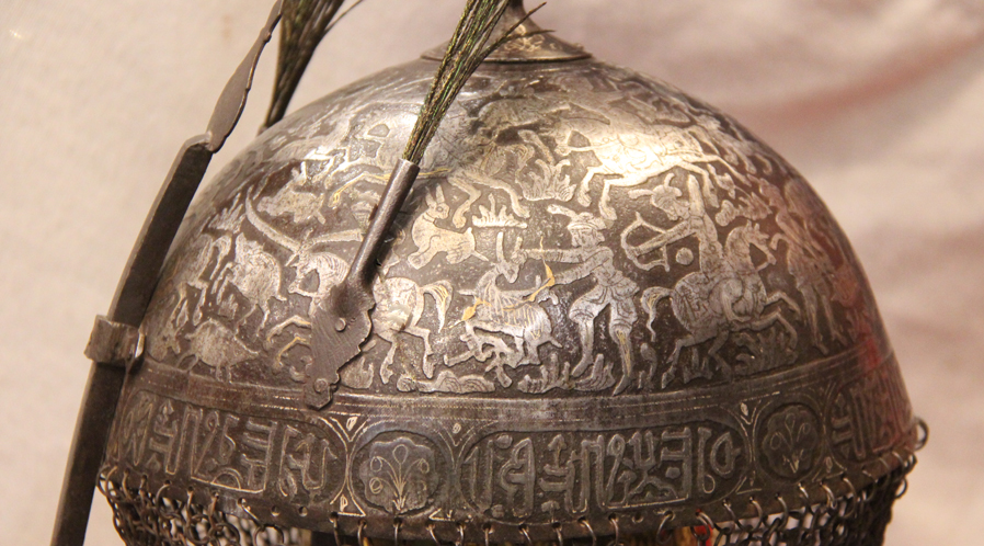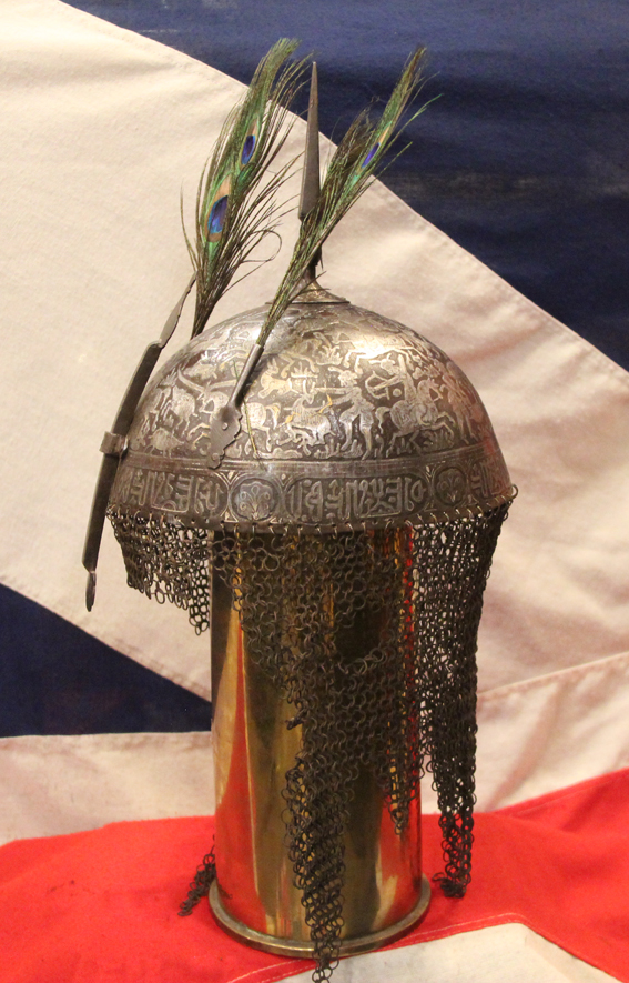 The helmet has a hemi-spherical skull engraved throughout, the skull fitted at its apex with a high spike, a pair of plume-holders at the front and with a staple for a sliding nasal guard, decorated over the greater part of its surface with traces of gold koftgari of scenes of a hunt, and a band of koranic Islamic text, and mail neck-defence of butted links. Khula Khud helmets of this design originated in Central Asia, and this form were worn by Persian Empire soldiers in the 18th and 19th Centuries.