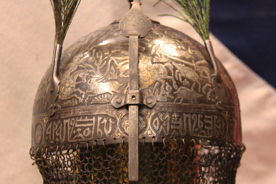 Some Mughal helmets feature calligraphic inscriptions from the Quran, supposedly to gain "Help from Allah and a speedy victory." Made of steel, these bowl-shaped helmets were designed as either low and flat, or high and pointed. They sometimes contained a spike socket such as this one, at the top of the helmet, which resembles a spearhead with a cross-like section.