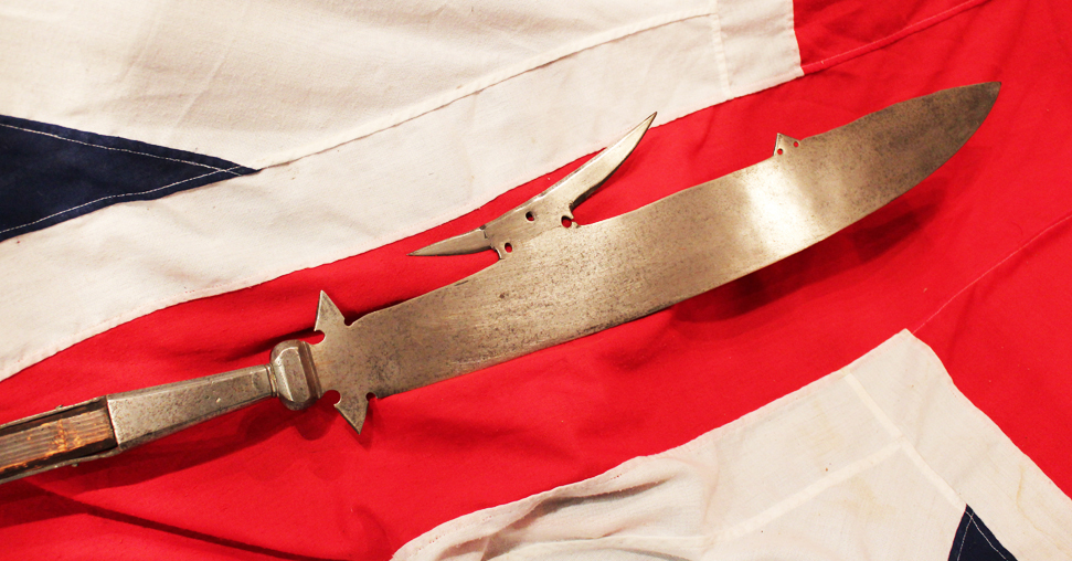Typically, the blade was from around 45 cm (18 inches) long, on the end of a pole 2 m (6 or 7 feet) long, and the blade was affixed in a socket-shaft configuration similar to an axe head, rather than having a tang like a sword or naginata. Occasionally glaive blades were created with a small hook on the reverse side such as this one to better catch riders on horseback. Such blades are called glaive-guisarmes.