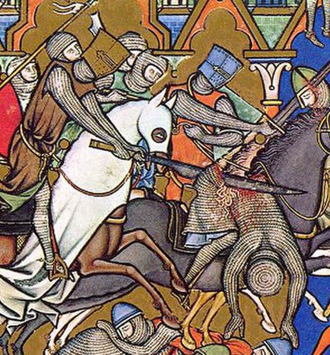 The Maciejowski Bible (Morgan Bible) depicts an example of a two-handed glaive used on horseback. Two images in our gallery are taken from the Morgan Bible (Folio 10 Verso - top). Notice the Warbrand in the forefront slicing into a mounted soldier with his glaive. Another early engraving of a knight with a glaive, and a group of men behing the king all with forms of glaive.
