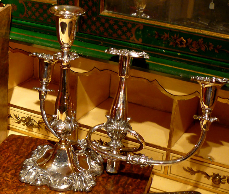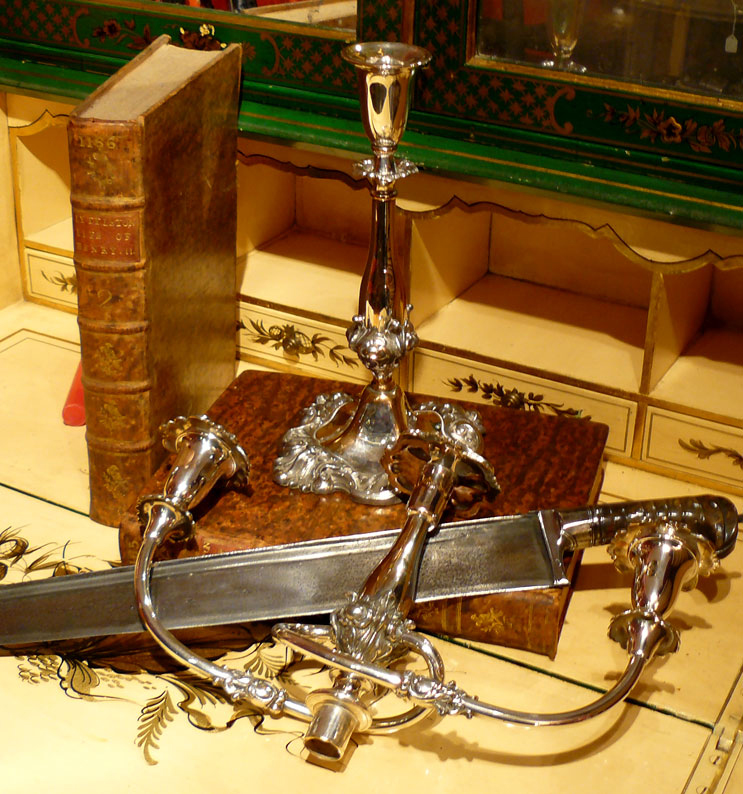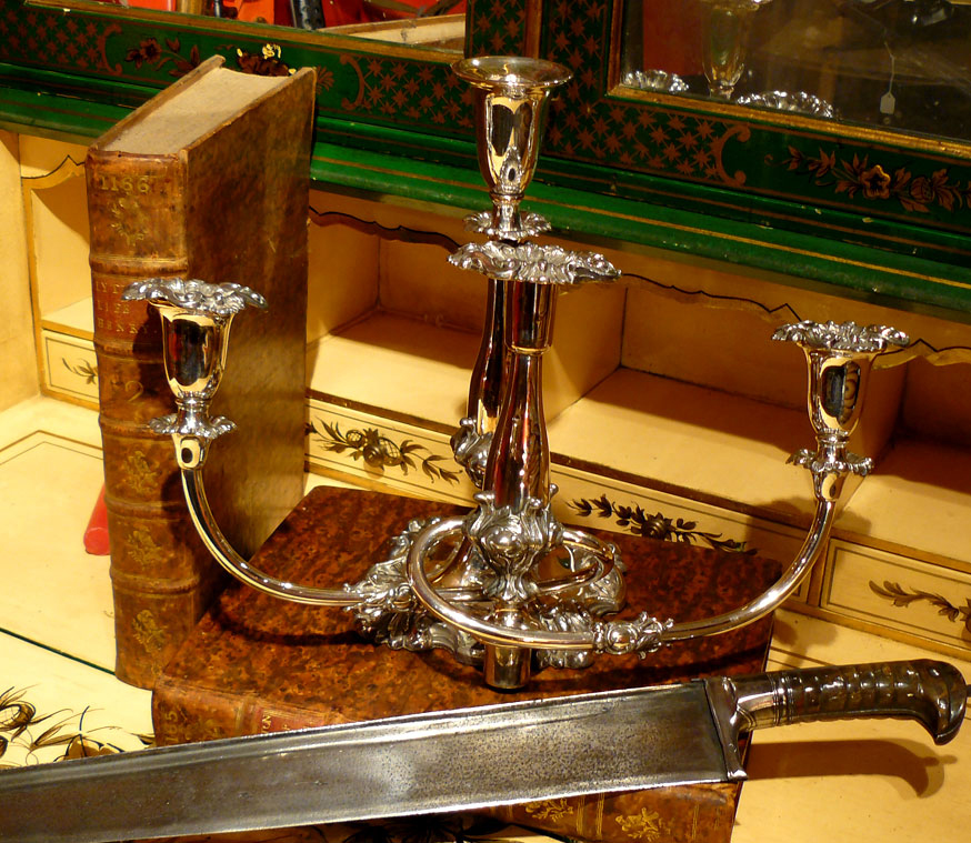 We acquired this stunning campaign, Sheffield silver plated candelabra, with his yataghan sword, used by a former Colonel of the 10th Hussars throughout his campaigning years in the army. The yataghan in these photographs we sold earlier, but we do have his other scabbarded yataghan. The Sheffield plating has wear on all the dominant edges and this is referred to as 'copper bleeding'. It is actually a traditional and good sign of originality for true Sheffield plate, as it shows it is early Sheffield hammered onto a copper base, not the later modern electrotype of plate, usually on nickel or brass. The use of "Sheffield plate" began in 1742 when Thomas Boulsover, a Sheffield cutler (blade smith), discovered that a sheet of silver fused to a piece of copper could then be rolled or hammered out without fracturing the bond.
