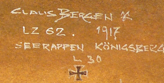 Signed Claus Bergen, of the German Navy, Luftschiff Crew, L30 formerly LZ62, dated 1917.