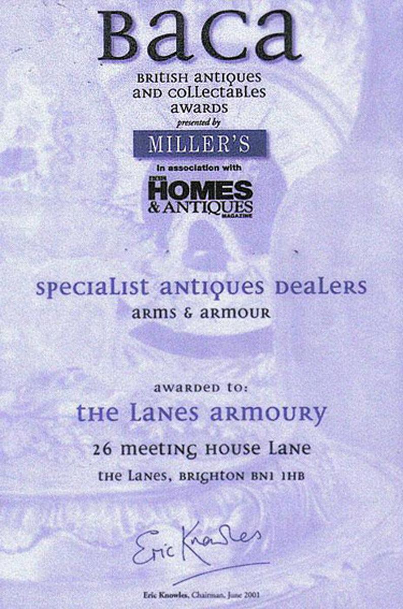 Twenty four years ago, after 80 years of their family’s trading in Brighton, the Lanes Armoury was honoured by being Nominated & Awarded by BACA, In The Best Antique & Collectables Shop In Britain Awards 2001
