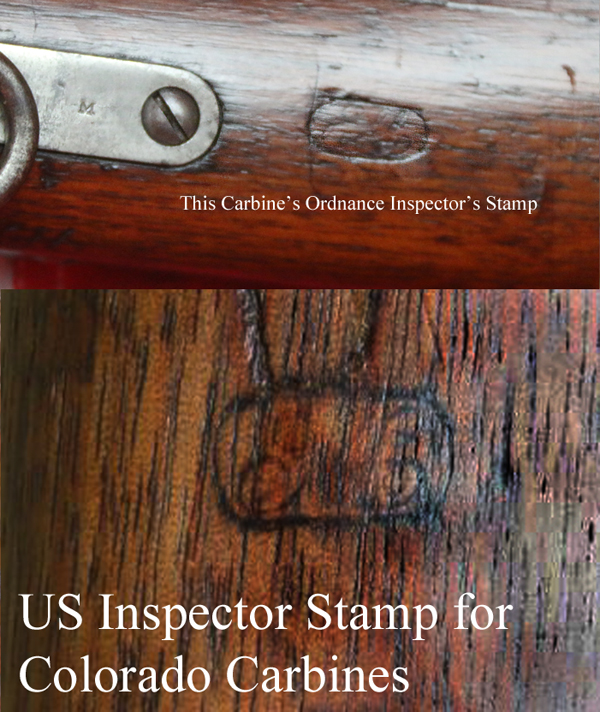 On October 16, 1868, 500 Burnside Contract Spencer Carbines were transferred by the Ordnance Department to the Colorado Territory. The Ordnance inspector cartouche remain visible on the left side of the stock behind the sling ring bar, this particular Ordnance stamp is also the ones used for the 500 Colorado Territory guns shipment.
