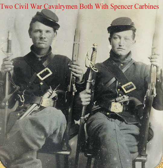 Major-General James H. Wilson, who was instrumental in crushing Hood at Nashville (15-16 Dec. 1864) and defeated Forrest at Selma (2 April 1865), wrote the following about them: "There is no doubt that the Spencer carbine is the best fire-arm yet put into the hands of the soldier, both for economy of ammunition and maximum effect, physical and moral. Our best officers estimate one man armed with it is equivalent to three with any other arm. I have never seen anything else like the confidence inspired by it in the regiments or brigades which have it. A common belief amongst them is if their flanks are covered they can go anywhere. I have seen a large number of dismounted charges made with them against cavalry, infantry, and breast-works, and never knew one to fail. It was the world's first practical repeater and fired a .52 calibre metallic rimfire cartridge (patented by Smith & Wesson in 1854 and perfected by Henry in the late 1850's} which completely prevented gas leakage from the back because the brass casing expanded on ignition to seal the chamber. It had a "rolling block" (actually a rotating block) activated by lowering the trigger guard. This movement opened the breech and extracted the spent cartridge. Raising the lever caused a new cartridge, pushed into position by a spring in the 7-round magazine, to be locked into the firing chamber. The 7-round magazine was located in the stock.