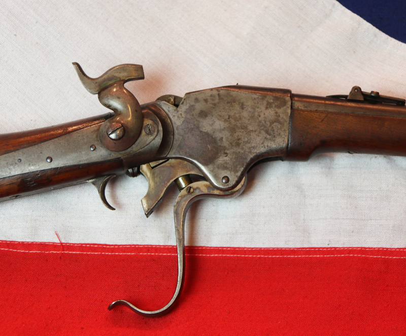 Introduced in Jan. 1862, it found its first major use by Col. John Wilder's Indiana "Lightning Brigade" of mounted infantry at Hoover's Gap during the Tullahoma Campaign (22 June - 3 July 1863). The firepower and speed of this unit overwhelmed Wheeler's cavalry guarding the southern end of this pass and allowed George H. Thomas's 14th infantry corps to place itself on the flank of the Confederate General Hardee. This sudden development misled Hardee into thinking he had been outflanked by the entire Union Army of the Cumberland, and he retreated without orders back to Tullahoma, 15 miles in his rear. Wilder then spearheaded the turning movement to the east of Tullahoma, and this in turn undermined Bragg's entire defensive line, and he had to pull back into Chattanooga. At the price of about 500 casualties the Union Army advanced 100 miles and made military history. Later, at the battle of Chickamauga (19-20 Sept. 1863), his troops used them with decisive effect on the first day, keeping Bragg's troops from cutting the road to Chattanooga, and slowing Longstreet's attack on the second day. This is the scarcer Burnside Spencer Repeating Rifle Contract Carbine,