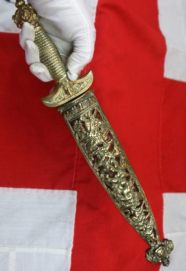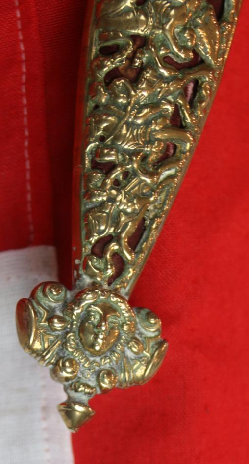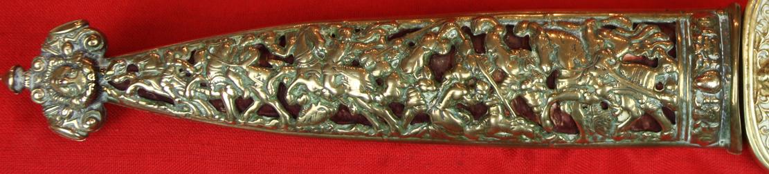 Wonderful 16th century pattern dagger, designed by Hans Holbein one of the greatest Old Master artists in the reign of King Henry VIII, with brass fully three dimensionally piecerd scabbard displaying scenes of Landsnecht knights mounted on horseback. This is not only a wondrous and extravagant dagger, it is a fine example object d'art. The dagger that gained its name from its design, and patterns of dagger, by Hans Holbein, one of the worlds greatest portrait artists of the 16th century, whose most famous owner of a Holbein pattern dagger was King Henry VIIIth, as can be seen in his portrait see the gallery. Holbein travelled to England in 1526 in search of work, with a recommendation from the renown Erasmus. He was welcomed into the humanist circle of Thomas More, where he quickly built a high reputation. He returned to Basel for four years, then resumed his career in England in 1532 under the patronage of Anne Boleyn and Thomas Cromwell. By 1535, he was King's Painter to Henry VIII of England. In this role, he produced portraits and festive decorations, as well as designs for jewellery, plate, and other precious objects, including daggers. His portraits of the royal family and nobles are a record of the court in the years when Henry was asserting his supremacy over the Church of England.