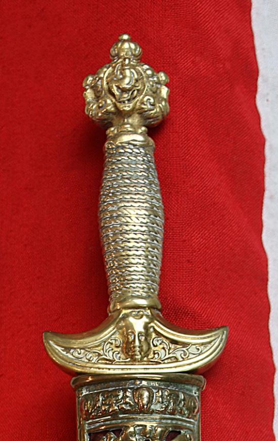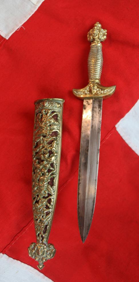 Double edged blade. This is a fabulous 19th-century representation of Holbein’s 16th century dagger, One of Holbien’s versions had a most similar pierced and chiselled decorative scabbard displaying scenes from the dance of death. In July 2000 Christie’s Auctioneers sold another 19th century representation of this Holbein dagger, it sold for £3,760, 25 years ago. The most famous example of a Holbein pattern dagger is depicted being worn by King Henry VIIIth in his portrait by Hans Holbein, we show this portrait in a gallery with Henry and his version of his personal most similar and beautiful Holbein Dagger. This Renaissance style dagger is based on original drawings from the work-books of Holbein the Younger, from whence the dagger gets its name. This is an accurate design that a nobleman of very high status could have chosen in around 1536, out of Holbein's work-books, and to have a personal dagger commissioned by a dagger maker.