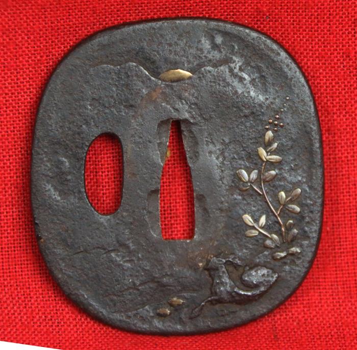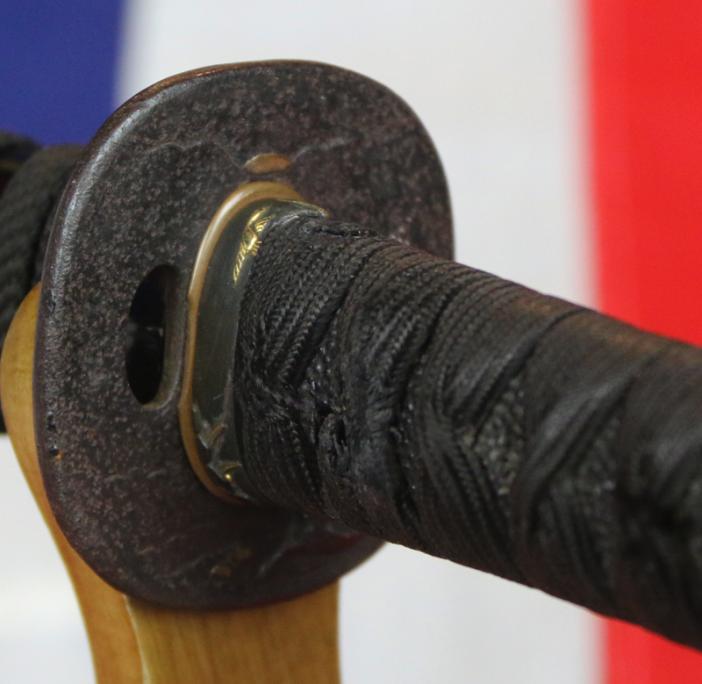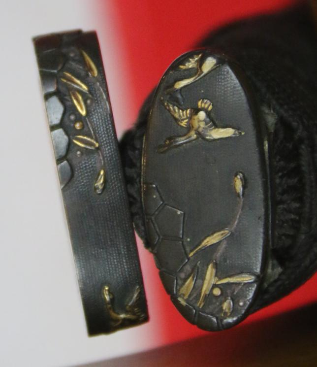 This rating is based on a book compiled by Yamada Asaemon V (山田浅右衛門吉睦), an official sword cutting ability examiner and executioner of the Tokugawa shogunate, and is an authoritative index of cutting ability of Japanese swords. The list of ratings concerning swordsmithing differs between Kaiho Kenjaku (懐宝剣尺) published in 1797 and the reprinted edition published in 1805, and the major revised edition of Kokon Kajibiko (古今鍛冶備考) published in 1830. Add up the number of sword smiths in each edition: Saijo Ō Wazamono 15, Ō Wazamono 21, Yoki Wazamono 58, Wazamono 93, and 3 grades mixed 65. The list of swordsmiths described below is the swordsmiths described in the first edition of Kaiho Kenjaku. The blade of shinogi-zukuri form, slightly undulating suguba of nioi with pronounced nie, indistinct tight mokumehada, the ubu nakago with kiri yasurime and one mekugi-ana, signed Echizen no ju Kozuke no kami Fujiwara Kanesada; koshira-e: the saya (scabbard) of roiro lacquer; ovoid iron stuba , shakudo fuchigashira with geese and reeds in gilt metal relief. The blade is in very good polish, the lacquer on the saya also very good and the original. Superb condition tsukaito silk hilt wrap .