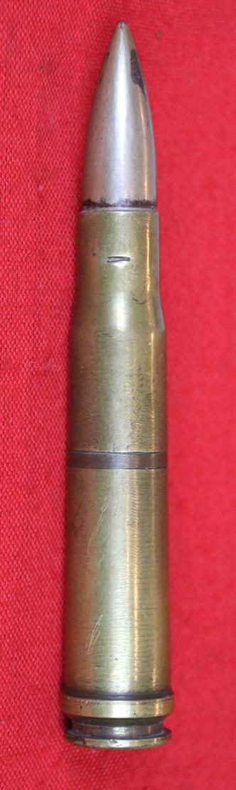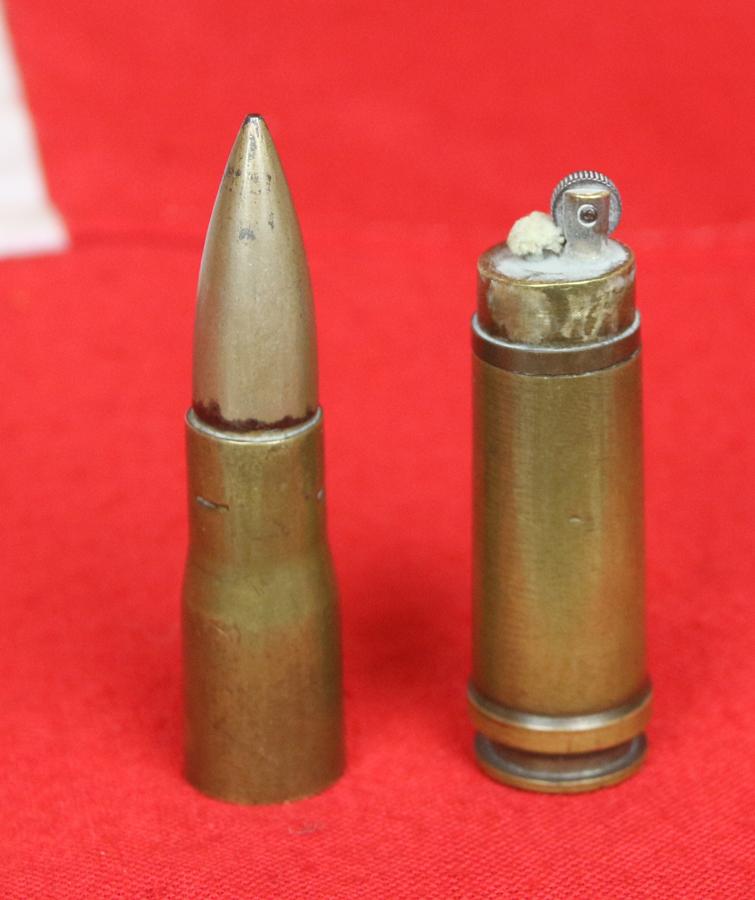A .55 Boys Mark 2 Anti-Tank Rifle.55 Boys Mark 2 1942 Dated Anti-Tank Rifle Round, converted to use as a piece of functional, servicemen's, 'trench art', a useful lighter on campaign. The rifle developed by Captain H C Boys, a designer at the Royal Small Arms Factory, Enfield resulting in the .55 Boys anti-tank rifle being adopted in 1937. Although the round was adequate against light tanks in the early part of the war, the Boys was ineffective against heavier armour and was phased out in favour of the PIAT mid-war. During the early campaigns, like Norway and France, the Boys performed adequately against the thinly armored Panzer I, II and IIIs. The first German tanks knocked out by British troops were by a Boys during the Norwegian campaign. Sergeant Major John Sheppard of the 1/5th Battalion, Leicestershire Regiment (TA) was deployed near the village of Tretten to help protect the right flank when three German Panzers approached his position. Taking up the Platoon’s Boys, which he had never used before, Sheppard fired three rounds into each tank, knocking out two of them and making the rest third retreat. For his actions that day, which helped keep the right flank of the British position solid, he was awarded the Distinguished Conduct Medal.The Boys anti-tank rifle was a bolt action rifle fed from a five-shot magazine, loaded by means of a 5 round stripper clip. The rifle was large, heavy with a bipod at the front and a separate grip below the padded butt. The Boys anti tank gun was also made in Canada and sold to America, we sold it to Russia, and Finland, and many thousands were captured at Dunkirk by the German's and issued by their special anti tank units. See photos in the gallery of the British Desert Rats using in against Rommel in Africa, the Finns using it against the Russians in the Finish Russian Winter War, and by the Germans in WW2. Not suitable top export due to bullet shape.