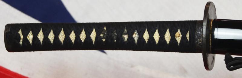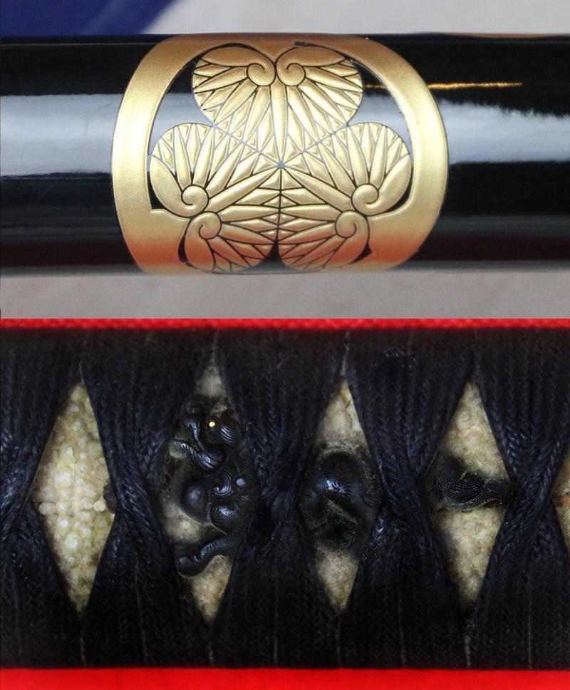 The late saya bears 4 deep relief gold aoi gold mon hiramaki-e low relief lacquer, the triple hollyhock leaf, of the Tokugawa, on a fine black lacquer ground. The tsuka has just been re bound in stunning black silk ito.