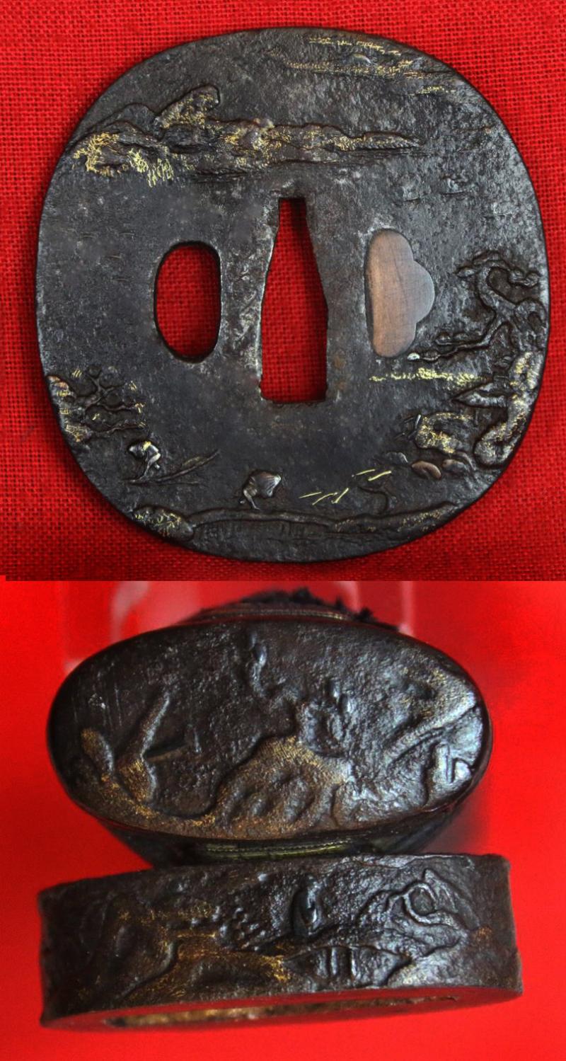 The theme of the koshirae is influenced by the Province of Hizen (肥前國). Forged iron (tetsu 鉄) hand guard (tsuba 鐔) is a work of the Jakushi (杓子) School based in the port city of Nagasaki (長崎) in Hizen Province, and inlaid with small silver and gold detailing. The artistic scene on both sides of the tsuba is that of a Chinese style painting made popular during the Ming Dynasty that was exported to southern Japan during the beginning of the Edo Period with the collapse of the Ming Dynasty (1644 CE). The fuchi-gashira (縁頭) is made of forged iron. The tsuba is signed by Jakushi (杓子) on its obverse face. The signature style is consistent with what the Jakushi School used during the Edo Period.