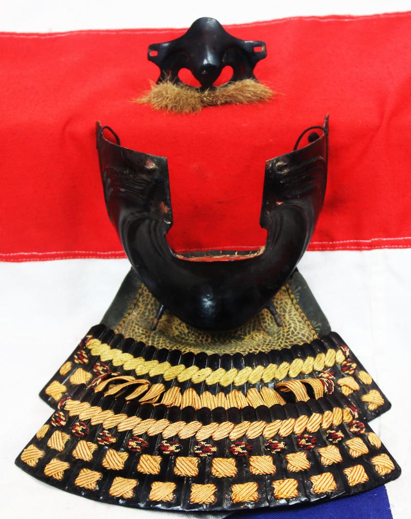 There are 4 types of mask designs that came into general use in Japan: happuri (which covers the forehead and cheeks), hanbō (covers the lower face, from below the nose all the way to the chin), sōmen (covers the entire face) and the me-no-shita-men (covers the face from nose to chin). We can also classify those mask depending on their facial expressions, most of which derive from the theatre masks. It has an asenagashino ana a hole under the chin to drain off perspiration and orikugi two projecting studs above the chin to provide a secure fastening to the wearer. In the 16th century Japan began trading with Europe during what would become known as the Nanban trade. Samurai acquired European armour including the cuirass and comb morion which they modified and combined with domestic armour as it provided better protection from the newly introduced matchlock muskets known as Tanegashima. The introduction of the tanegashima by the Portuguese in 1543 changed the nature of warfare in Japan causing the Japanese armour makers to change the design of their armours from the centuries old lamellar armours to plate armour constructed from iron and steel plates which was called tosei gusoku (new armours). Bullet resistant armours were developed called tameshi gusoku or (bullet tested) allowing samurai to continue wearing their armour despite the use of firearms.