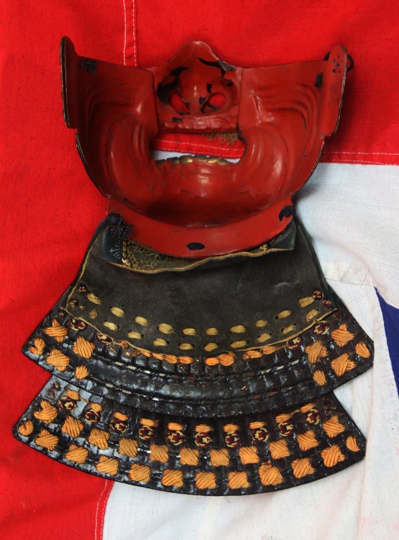 This is a wonderful piece of Japanese Samurai 'art' made for warfare, which features a kuchi hige (mustache), shiwa (facial wrinkles). Extremely collectable art that is most desirable in its own right, often stunningly used for interior decoration as an individual work of samurai art in its own right. A very good urushi lacqured embossed iron mask of 'Me no Shita Men' (half face) type. Mid Edo period 18th century. Typical Myochin school craftmanship with very sharp embossing. A multi coloured silk bound yodarekake, neck defence with hooked standing cord pegs for attaching with cords to the samurai. A doeskin top to the neck defences decorated in a black inked pattern of Shishi lion dogs on a leaf pattern background. The inner face is decorated with vermillion lacquer, and the neck lames are covered in black urushi lacquer under the cords. Face armour, menpo, is samurai armour, and this is called 'with a fierce expression' masks They were worn with the Samurai's armours to serve as a protection for the head and the face from sword cuts. Even if the mask in unsigned, the type, and its the features suggest this fabulous face armour menpo was made by a smith from the Myochin school.