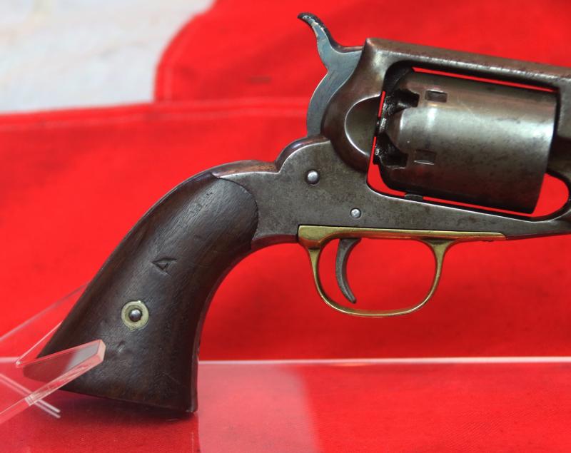 Beals’ 1858 patent (21,478) was granted on September 14th of that year and covered the winged cylinder arbor pin that secured the cylinder to the frame, which was retained by the loading lever located under the barrel and could be withdrawn from the frame only when the lever was lowered. Thus, began the evolution of the second most used US marital revolver of the American Civil War. The first guns were produced in .36 caliber and production started to roll off the assembly line during late 1860 or early 1861. The .36 calibre “Navy” revolver was followed by a .44 calibre “Army” variant soon thereafter. By the time Beals pattern revolver production ended in 1862, some 15,000 of the “Navy” sized handguns had been produced, while only about 2,000 of the larger “Army” revolvers were manufactured. The subsequent model was the William Elliott “improved” Model 1861 pattern Remington revolvers, also known to collectors as the “Old Model” Remingtons, started to replace the Beals models by the middle of 1862.