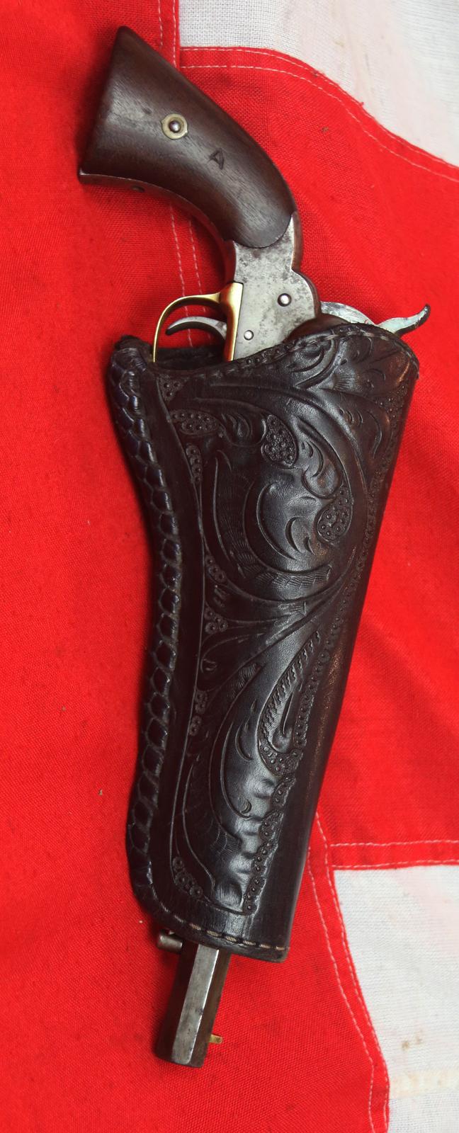 Manufactured between 1861 and 1863, approximately 14,500 Remington-Beals Navy revolvers were produced. About 500 martially-marked examples of this model were purchased by the U.S. Army, and an additional 1,000 were bought by the Navy. In 1875, the Navy returned about 1,000 various model Remington .36 calibre revolvers, including the Beals Navy, for factory conversion to accept the .38 calibre centre fire metallic cased cartridge. Sn 10402. Sold with an old but later tooled leather holster, that is complimentary, and free.