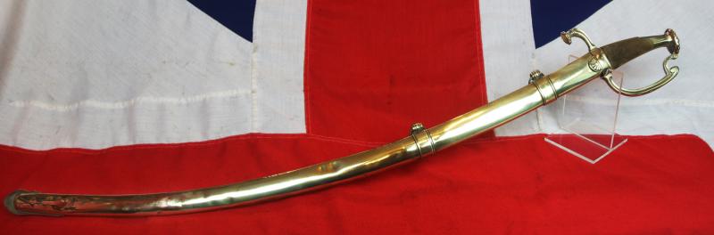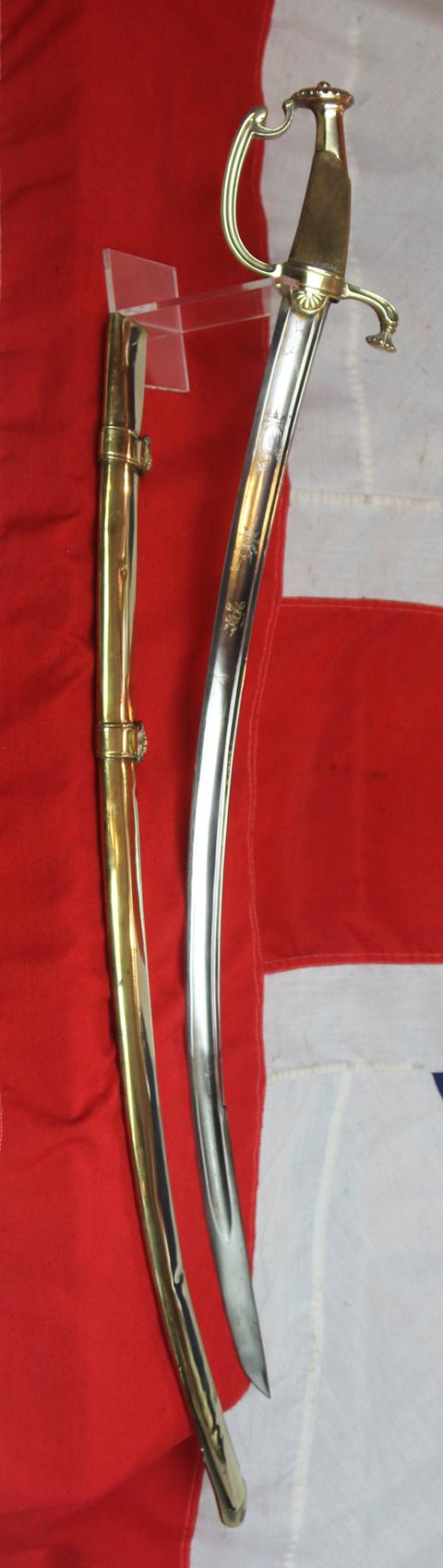 An original Consular period, 'Marengo' style light cavalry officer's sabre, with very fine and bright Montmorency-style blade one-third beautifully engraved with an incised decoration of weapon trophies and foliage, gilt bronze hilt, mellon pattern pommel, single guard branch with a side engraved with a farandole of foliage, the front side has a V-shaped groove, the rear side has a concave gutter, basal half ear, quillon arched towards the front with button ending, cross hatched carved wooden grip, in its origina sheet brass scabbard, two large brass bands each carrying a supension ring,