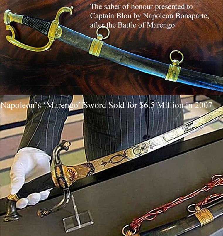 Napoleon ordered a sword to be commissioned based on his own sabre and presented it as a Sword of Honour to Captain Blou for his important and vital service at Marengo, and that sword is near identical to this sword that we offer. See photo 10 in the gallery. Napoleon’s Marengo sword was sold at auction in 2007 for $6.5 million dollars.