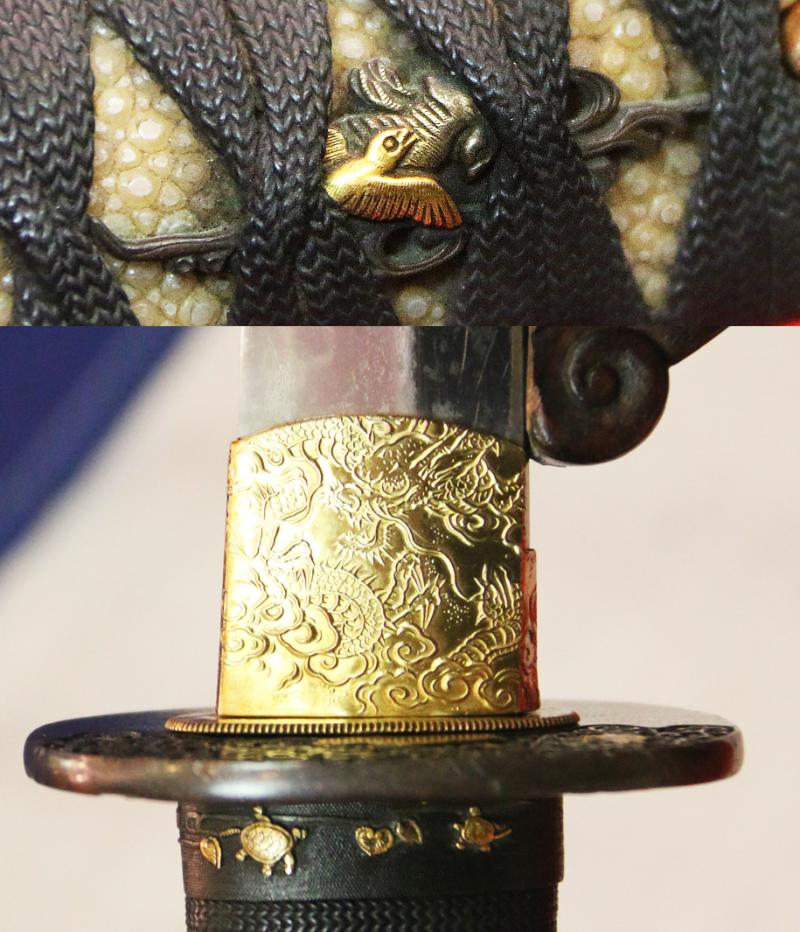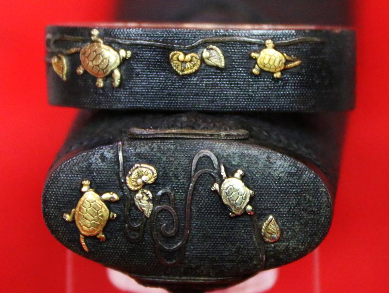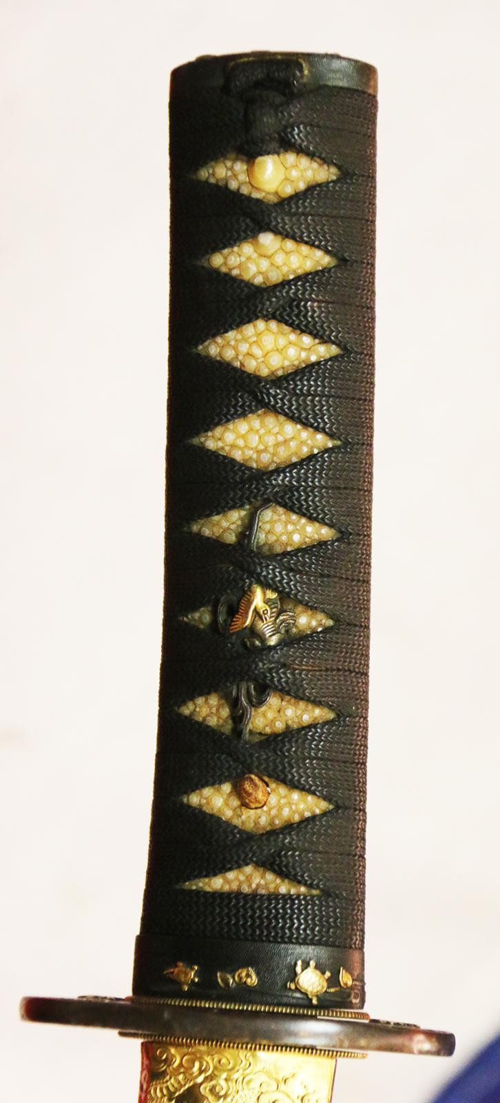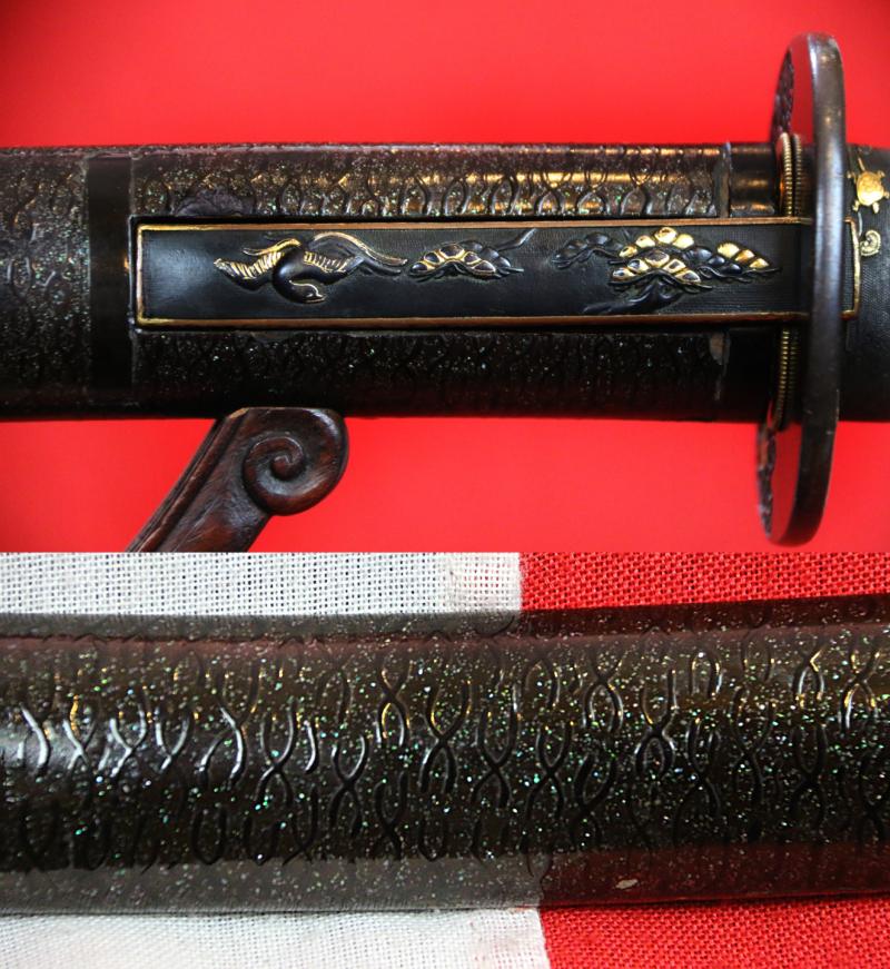 The saya is one of the most beautiful we have seen with all its original urushi lacquer of a black base ground decorated with crushed abilone, over lacquered with clear urushi nad then takebori symbols of open ended infinity throughout. It has its all original Edo period shakudo and gold mounts of superlative beauty of the turtles. According to traditional Japanese beliefs, the turtle is a haven for immortals and the world mountain, and symbolizes longevity, good luck, and support. It is the symbol of Kumpira, the god of seafaring people especially. He is said to have lived tens of thousands of years.