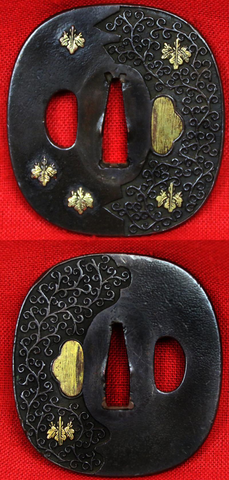 The tsuba is an absolute gem in shakudo with hammered pure gold onlaid paulownia leaves set in half surface decorated hand carved takebori open fretwork of tendrils. Paulownia is a symbol of good fortune, royalty, and the imperial family in Japan. It's depicted in the seal of the Prime Minister and used in various government emblems. The menuki are birds of paradise and shakudo and gold flying in clouds and match the very same design on the kodzuka, a bird of paradise, of gold and shakudo, utility knife, stored in the traditional kozuka saya pocket.