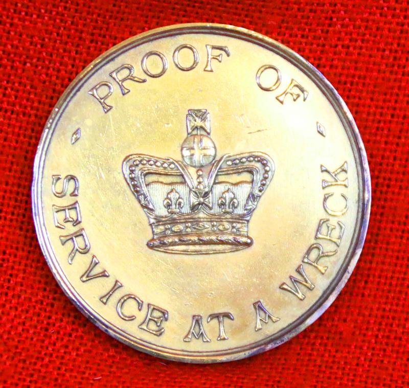 Afterwards all those who helped at a shipwreck were awarded one of these coin medals which they could redeem for cash if they so chose. The lesser version had a redemption value of 2/6 {two shillings and sixpence} For attending a wreck, or,.this superior type has a redemption value of 5/- {five shillings} For proof of rocket launching service at a wreck, but with an extra 1/- {one shilling} awarded for saving a life.