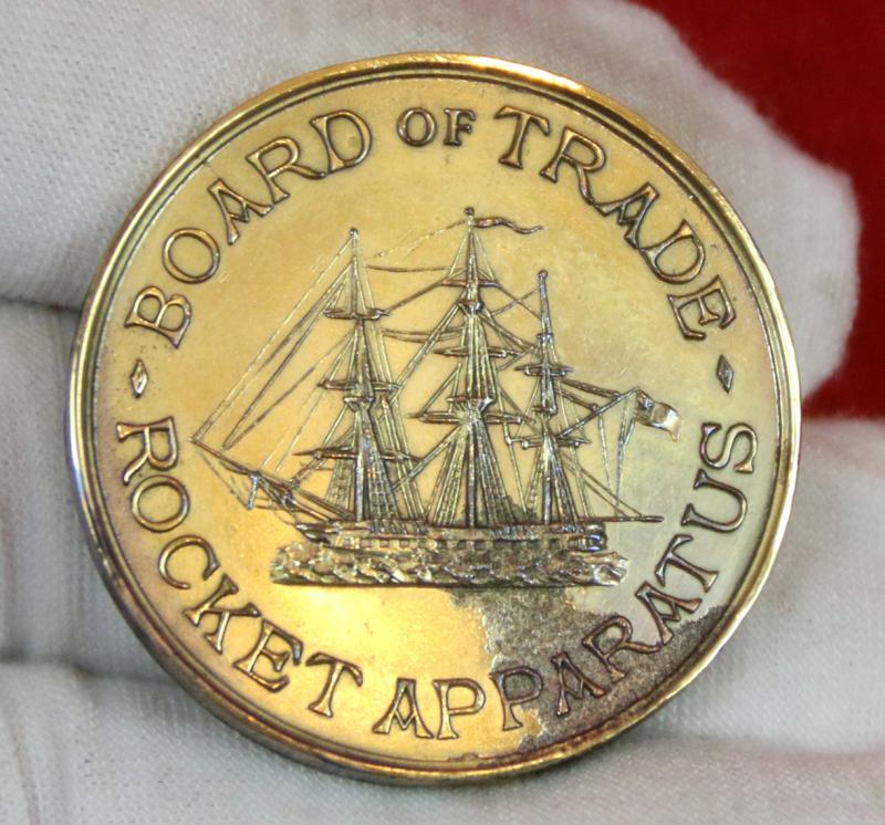 The Board of Trade owned the apparatus which was held at Coastguard Stations. Users could claim expenses from the board. The rocket apparatus was used to fire a line to a ship in distress. The line then used to haul over hawsers and the block to be affixed to the mast. Once fixed a breeches buoy could be used, hauled on a continuous whip line, to take off passengers and crew one by one. It was used by Coastguards but also by Volunteer Life Brigades and Life Saving Companies. The first of these founded in Tynemouth in 1864. Coastguards trained the volunteers in the use of the rocket apparatus. This was a medal come coin that had a face value.