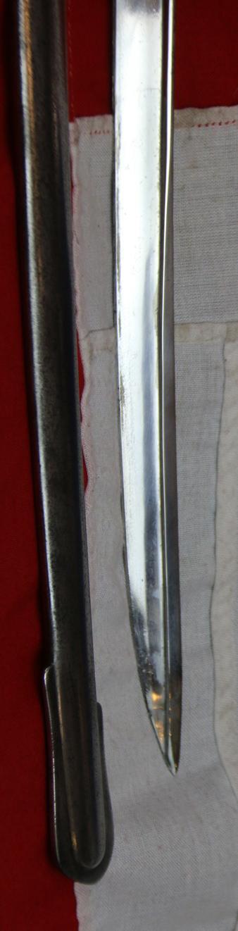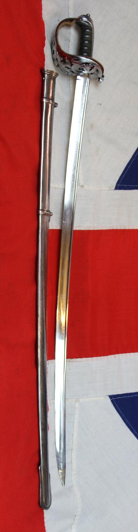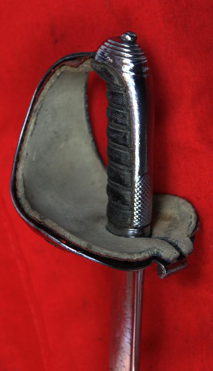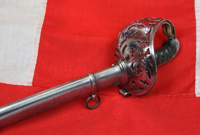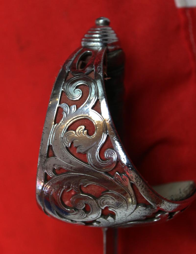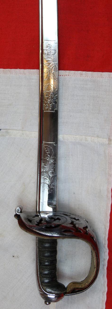 The sword is bright steel with highly attractive finish snd and a near mint VR cypher etched panelled blade with maker mark. The hilt is the pierced scroll ancanthus leaf pattern ceasing with its original wire bound sharkskin grip. It also has its very very rare, original red cloth lined original buff hide inner liner . The external steel does have traces of old surface age pitting.