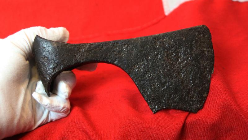 An iron axehead with triangular socket, narrow blade with curved edge with beard section.