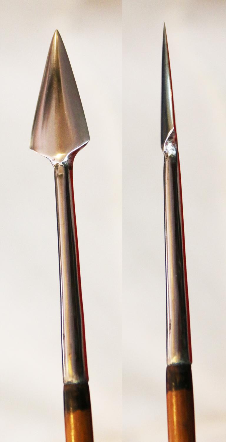 Another photo shows an unmounted arrow head set in an arrow head stand, with the considerable length of the tang that is completely concealed by the bamboo haft. The tangs of arrow were often signed just as swords.