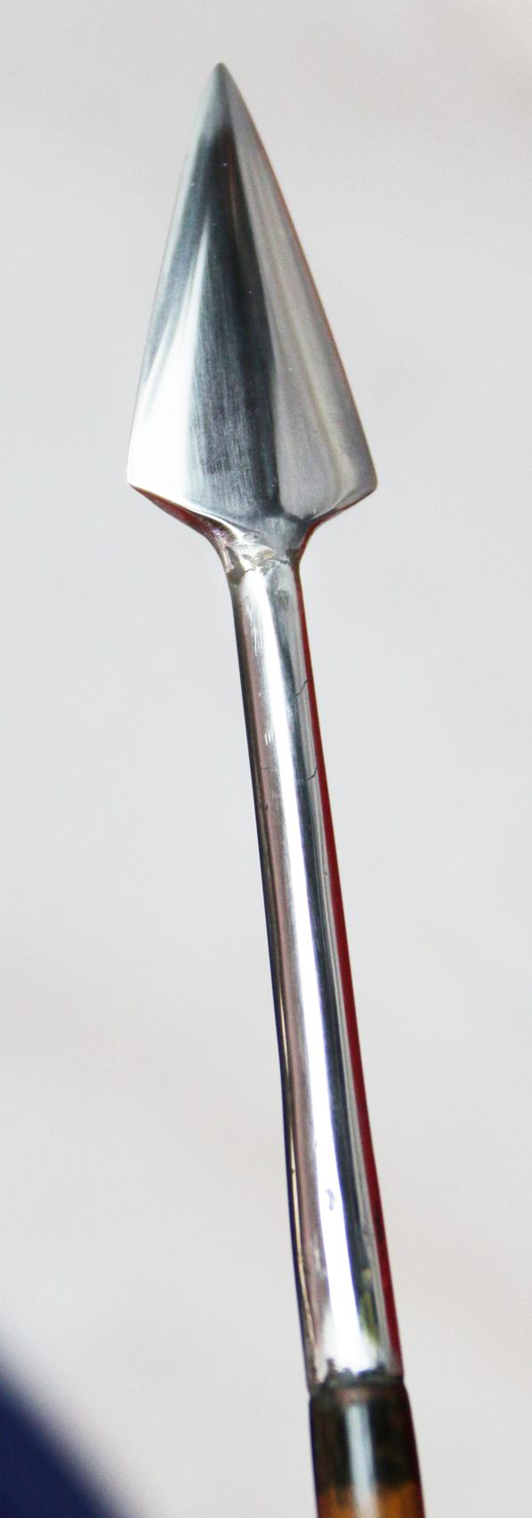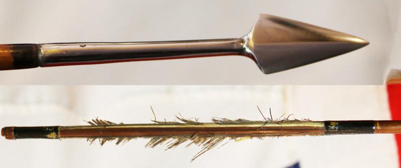 The arrow head with a wide cutting blade, especially effective against flesh, is brightly polished, hand crafted of traditional tamagahane steel, by a sword smith A long elongated arrow head, original and bespoke with folding and tempering exactly as would be a samurai sword blade, possibly signed on the tang under the binding but we would never remove it to see. The Edo period early eagle feathers are now much worn.