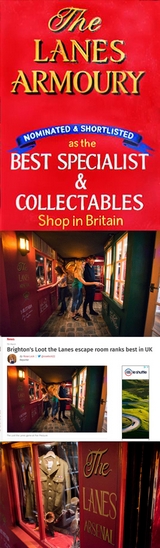 An interactive game for all the family based around our shop, voted the best in the UK. For Visitors to Brighton That Enjoy Interactive Games for 'All The Family', Try Pier Pressure Escape Rooms at 33 Upper North St, Brighton BN1 3FG. They have an Internationally renown "Escape Room", it was voted 64th best in the world, out of 82,865 interactive escape rooms worldwide, and the very best one in the UK. The Escape Room is Titled "Loot The Lanes" and it is based around a recreation of our shop, The Lanes Armoury. Loot the Lanes, which pays homage to several of the city?s landmarks, is a fast-paced interactive game in which players go on a mission to steal legendary treasure to stop it falling into the wrong hands.